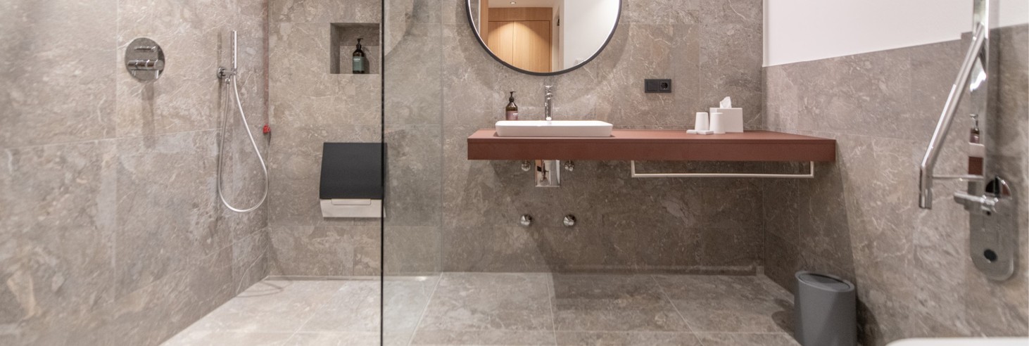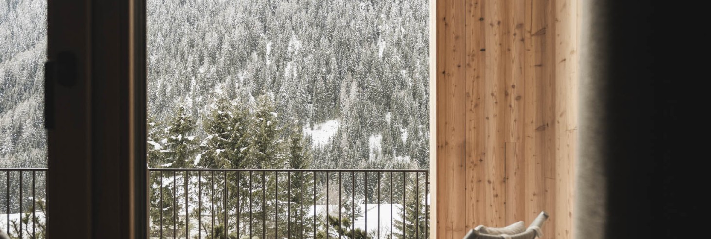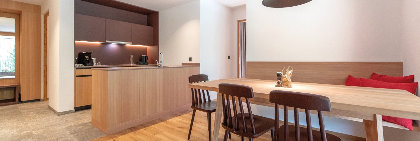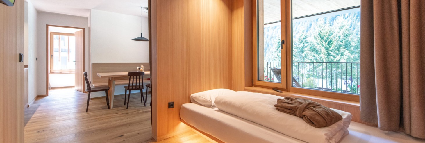 Camera matrimoniale con letto doppio e TV a schermo piatto, camera per bambini con letto e piccolo divano vicino alla finestra, soggiorno con divano letto (materassi di alta qualità, struttura del letto in legno massiccio), Smart TV e tenda per maggiore privacy, zona giorno con angolo cottura e tavolo da pranzo con panca, ingresso con ampia guardaroba, due bagni (entrambi con lavabo, WC e doccia, uno dei quali è privo di barriere). Mobili profumati in legno naturale di rovere e larice. Ampio balcone con vista mozzafiato sulle montagne e sulla natura di Vals. Per un riposante pisolino diurno, tutte le stanze sono dotate di tende oscuranti. Due appartamenti di questa categoria sono senza barriere.