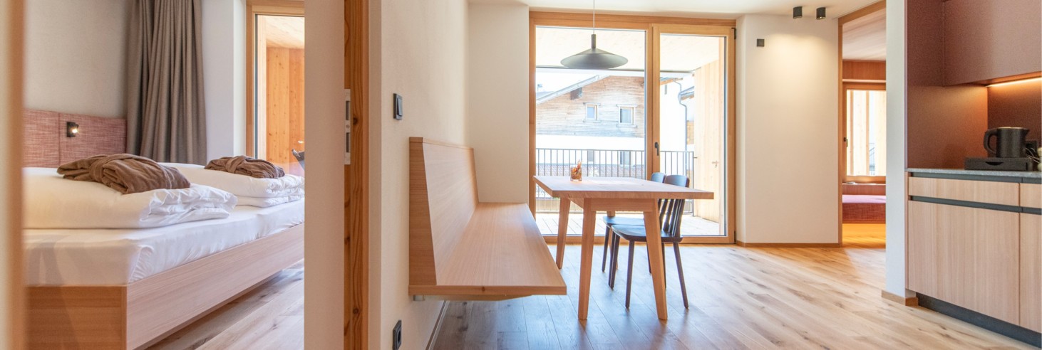 Camera matrimoniale con letto doppio e TV a schermo piatto, soggiorno con divano letto (materassi di alta qualità, struttura del letto in legno massiccio naturale), Smart TV e pesante tenda da chiudere, ampia sala da pranzo con tavolo da pranzo e panca in pregiato legno massello, ingresso con guardaroba, bagno (separato da stanza con WC e bidet). Mobili profumati in legno naturale di rovere e larice. Ampio balcone. Grazie alle tende oscuranti di alta qualità in tutte le stanze, la luce rimane fuori a richiesta e un riposante pisolino pomeridiano non è più un problema.