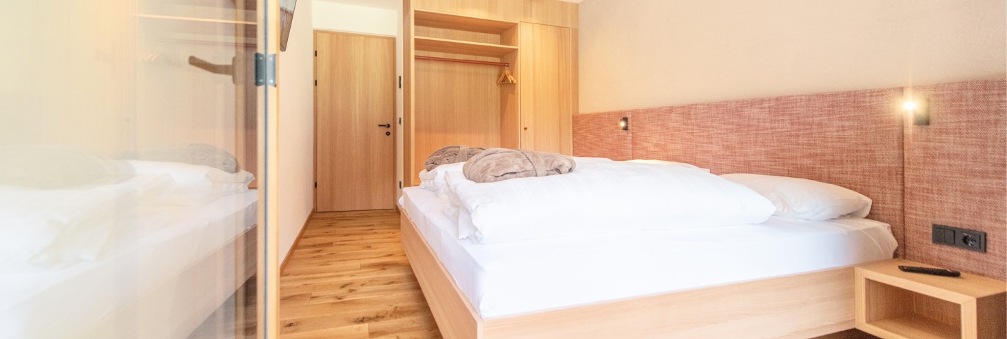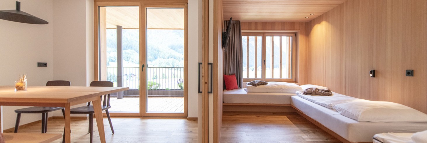 Camera matrimoniale con letto doppio e TV a schermo piatto, soggiorno con divano letto (materassi di alta qualità, struttura del letto in legno massiccio naturale), Smart TV e porta scorrevole, angolo cottura con tavolo da pranzo e panca in pregiato legno massello, ingresso con guardaroba, due bagni (uno con doccia e WC, l'altro con doccia, bidet e WC). Mobili in legno naturale profumato di rovere e larice. Ampio balcone con vista splendida sulla natura e sulle montagne di Vals. Per un tranquillo pisolino pomeridiano, tutte le stanze sono dotate di tende oscuranti.