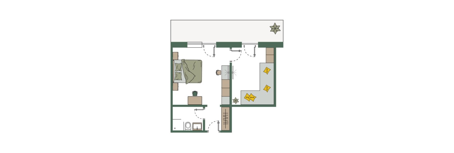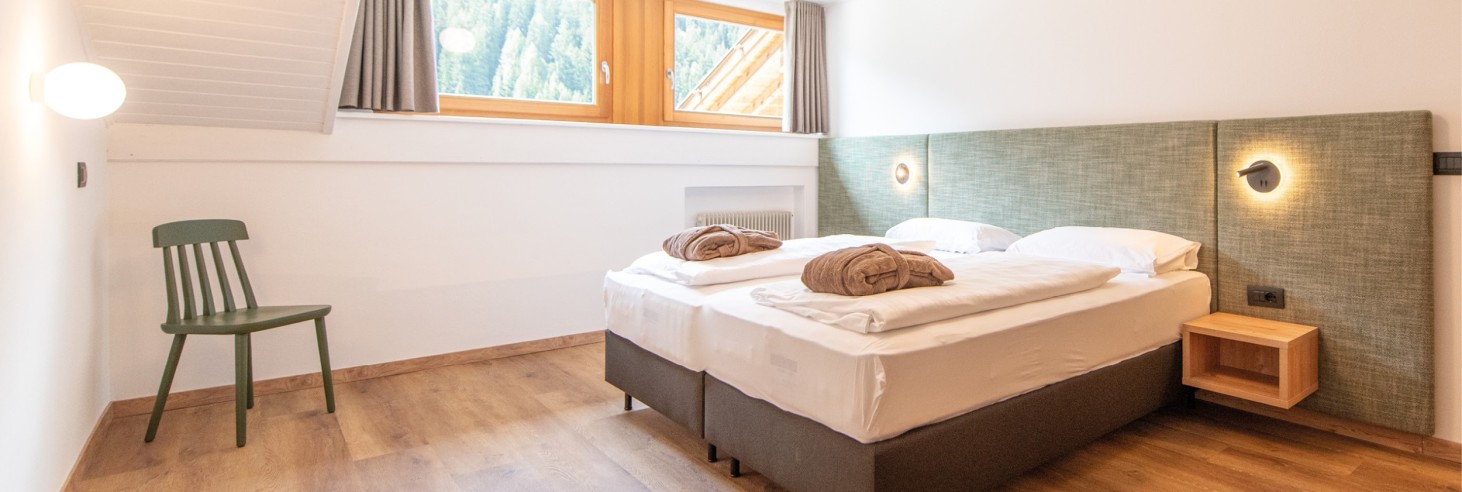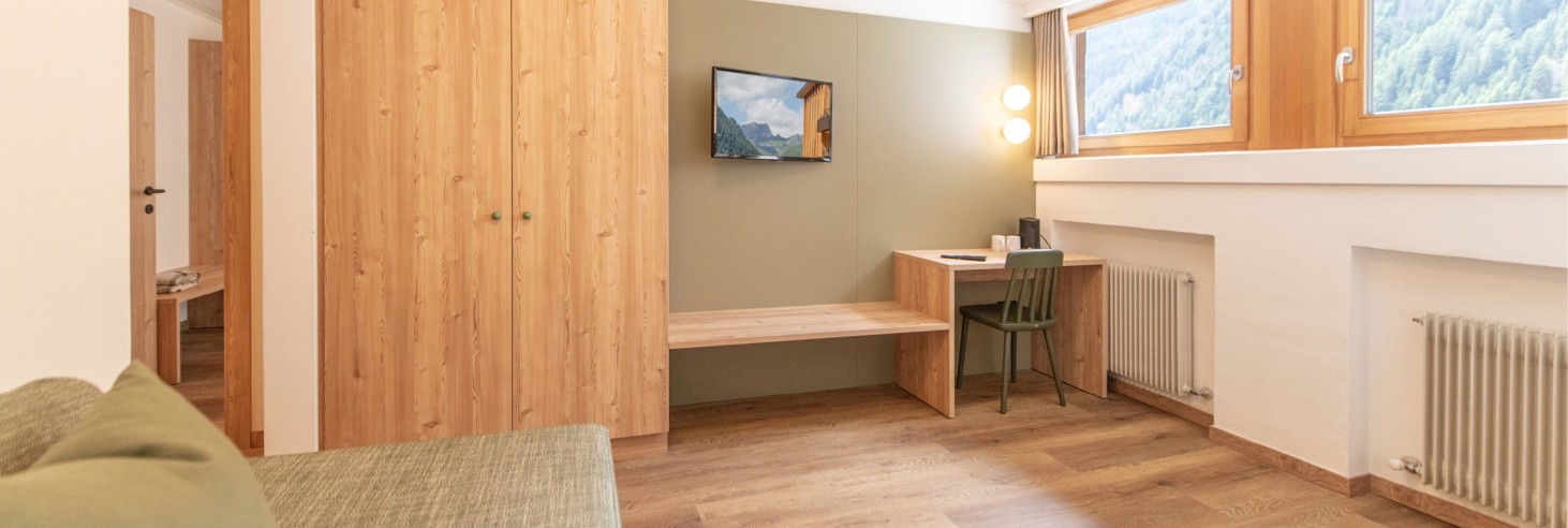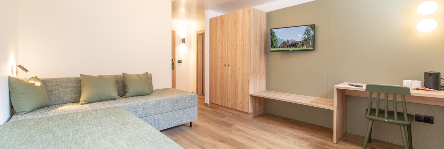 Camera familiare dal design naturale e con un'atmosfera piacevole per una vacanza in famiglia di quattro o – se il terzo figlio non è ancora troppo grande – di cinque: eventualmente è possibile aggiungere un letto supplementare/lettino da viaggio. Le speciali tende oscuranti sono presenti in ogni camera e permettono un riposo pomeridiano indisturbato.
