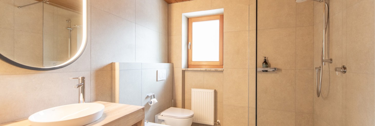 Bagno con doccia, lavandino e WC